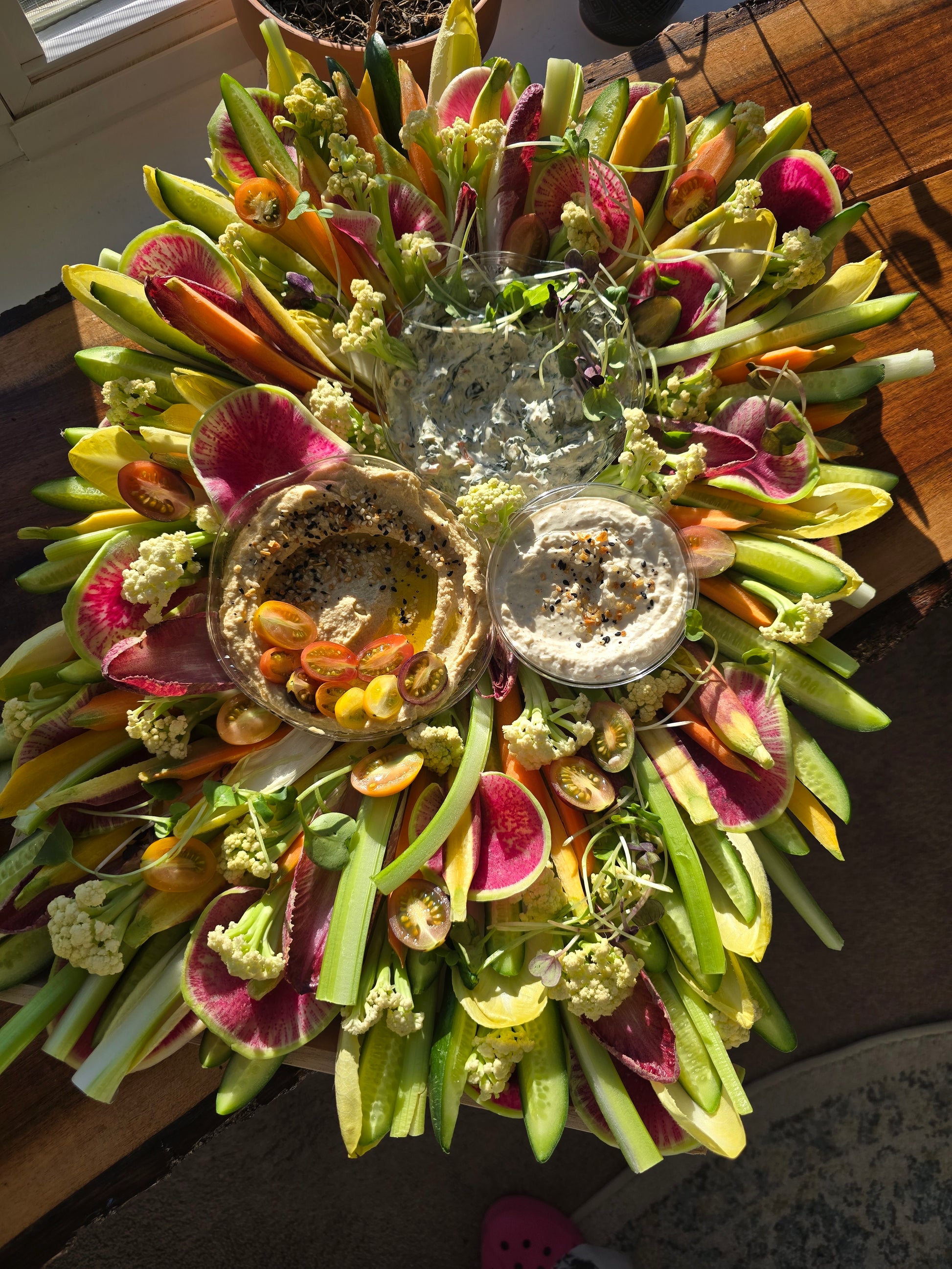 A selection of our favorite seasonal vegetables along with two dips. The variety and type of vegetables used is 100% dependent on seasonal availability
